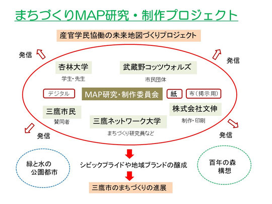 このMAPの研究・制作は、特定非営利法人三鷹ネットワーク大学推進機構の令和6年度「民学産公」協働研究事業に採択されたもので、構想から調査を経て約5年間をかけて完成しました。研究・制作にあたっては、「まちづくりMAP研究・制作委員会」を立ち上げ、推進しました。